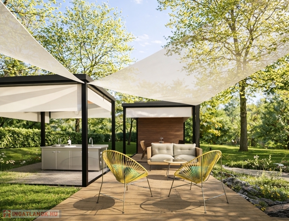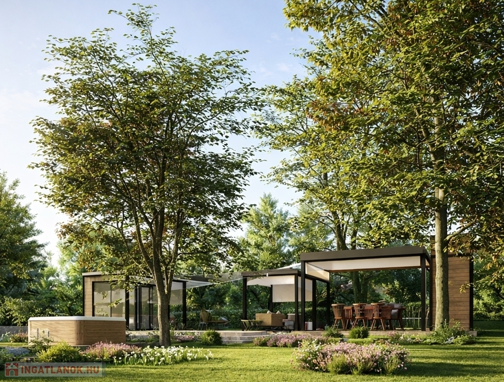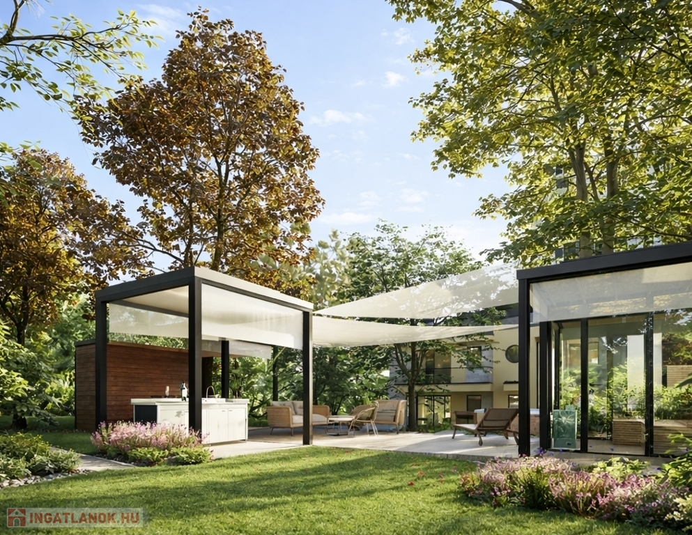 Az épület mögött elhelyezkedő, automata öntözőrendszerrel ellátott, zavartalanul használható kert valódi második élettérként került kialakításra. Itt kapott helyet egy prémium minőségű Jacuzzi, egy üvegfallal határolt finn szauna, valamint a napvitorlákkal árnyékolt kerti lounge, amely az alumínium pergolák alatt kialakított kültéri grillkonyhával és étkezővel kapcsolódik össze, ideális teret teremtve a pihenéshez és a baráti összejövetelekhez.