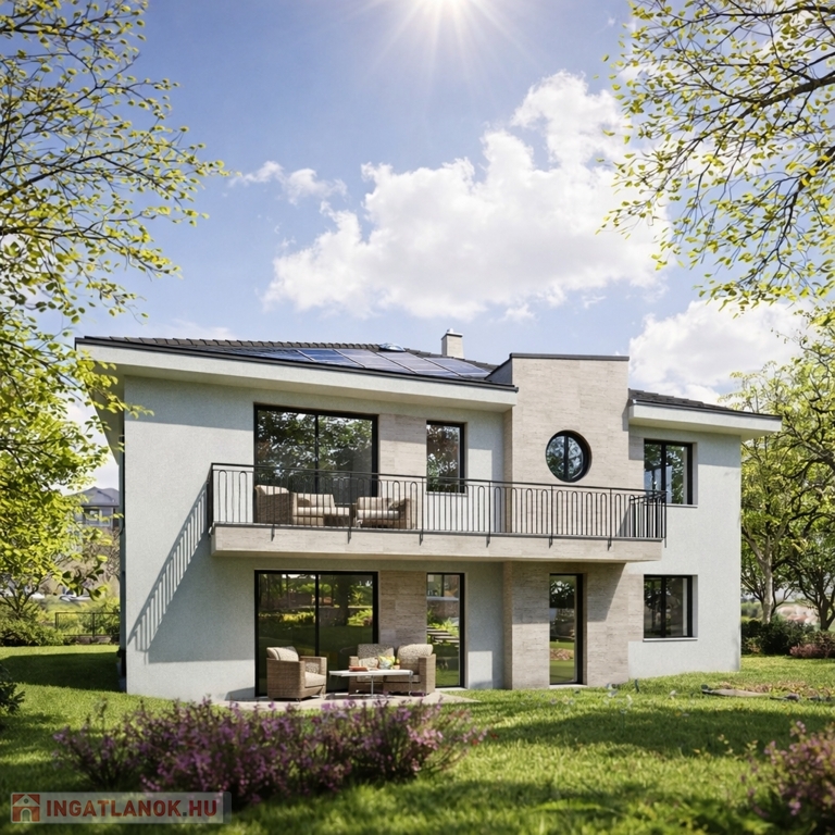 SZIGETÜZEMŰ NAPELEMES rendszer, 10 kWh-s akkumulátorral , „H” tarifás villanyórával, 3X40A + 1X16A elektromos teljesítmény, grafitos külső hőszigetelés, mészkő homlokzati díszítések, napelemes antracit tetőcserép, háromrétegű üvegezésű, alumínium külső burkolatú nyílászárók, valamint motoros alumínium redőnyök és beépített szúnyoghálók járulnak hozzá a magas komfortszinthez.