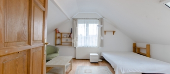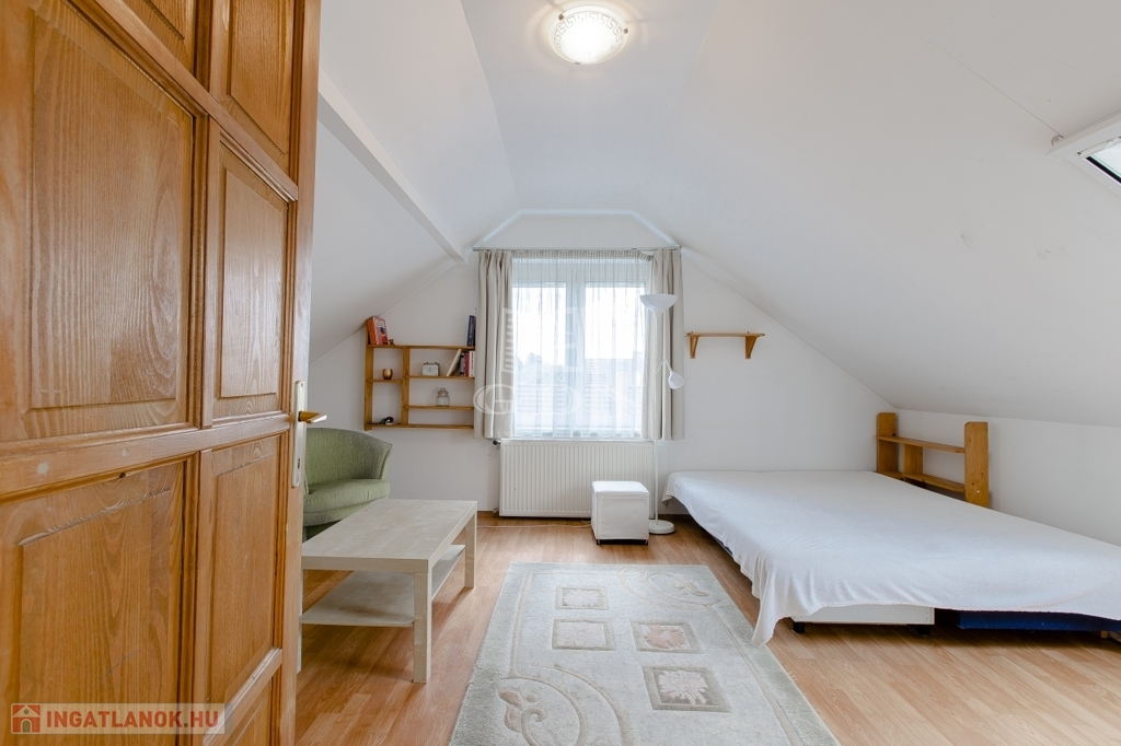 Szintén a közlekedőből jutunk fel a beépített teljes értékű tetőtérbe, ahol ki lett alakítva 2 db külön nyíló szoba, gardrób helyiség és egy zuhanyzós fürdőszoba. A nagyszoba további lehetőségeket rejt magába, szinte bárhogy lehet alakítani, akár 2 db szobává is.