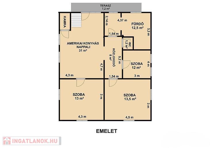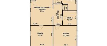 3 szoba, amerikai konyhás nappali, zuhanyzós + kádas fürdőszoba, mellékhelyiség, kamra, közlekedő, erkély.