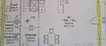 Földszint: amerikai konyhás nappali + étkező, szoba, kamra, zuhanyzós fürdőszoba + wc, közlekedő, előszoba, terasz.