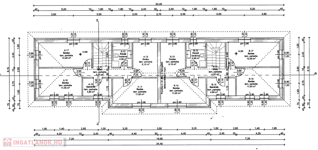 12,48 m2, 8,16 m2, 11 m2) plusz gardrób szoba 4,9 m2.