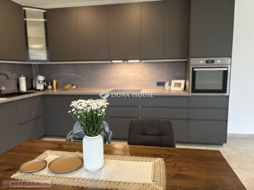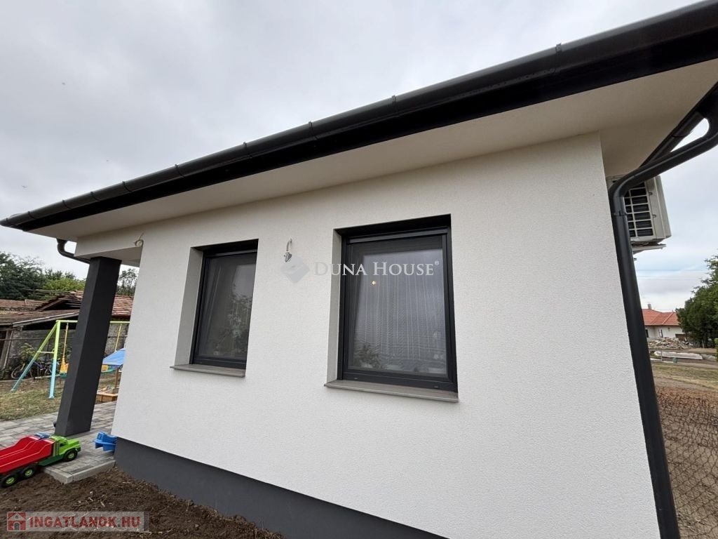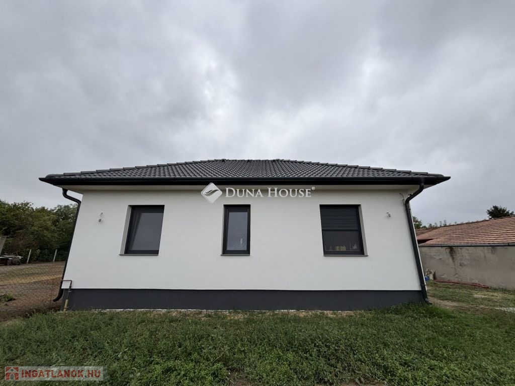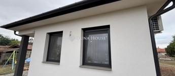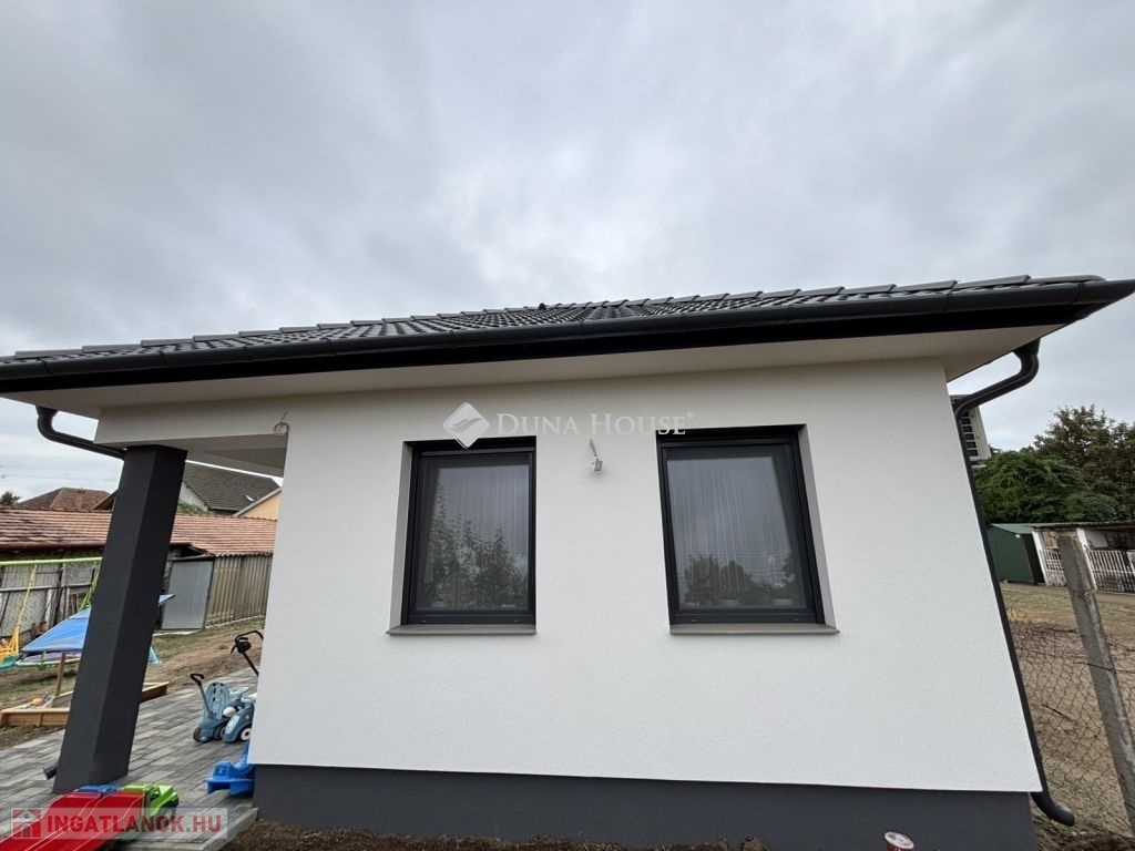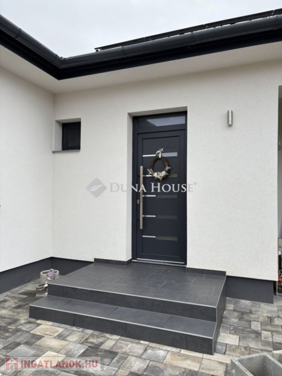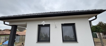 874 m²-es telken, (önálló helyrajzi számon nyilvántartott) 106,86 m² alapterületű, tégla fő- és válaszfalakkal épült, nappali + 3 szobás családi ház várja új tulajdonosát.Modern, okos családi ház eladó csendes környékenFőbb jellemzők:-Teljes körű LOXONE okosotthon rendszer: fűtés, redőnyök és riasztórendszer, amely szabadon bővíthető, és távolról (telefonról) is vezérelhető.-Energiatudatos működés: 3,4 kW napelem rendszer, kondenzációs gázkazán és szobánként külön szabályozható padlófűtés.-Klímakomfort: Daikin Comfora hűtő-fűtő klíma (3,5 kW) + előkészítés további egységhez (hálórész).-Biztonság: kültéri IP kamera (TP-Link, mobilról elérhető) és riasztórendszer.-Prémium nyílászárók: 3 rétegű, GEALAN S9000 ablakok, kívül-belül antracit színben, elektromos alumínium redőnyökkel és szúnyoghálóval.-Időtálló részletek: színezett alumínium ereszcsatorna, kívül-belül műkő párkányok.Belső kialakítás:-Teljesen gépesített IKEA konyha, és PAX gardróbszekrény.-Geberit dupla mosdós fürdőszoba szekrény fűthető Geberit Xeno tükörrel.-Geberit rimless fali WC-k.-Full Doors CPL fóliás ajtók tömör faforgács betéttel.-Bette 180x80 titánacél kád, Hansgrohe csaptelepek.Telek és környezet-Privát, nyeles telek, csendes elhelyezkedéssel, teljes nyugalmat biztosítva.-30 m²-es térkövezett terasz.-Fúrt kút és kerti csap.-6 m²-es kerti tároló pincével.Az udvar végső kialakítása az új tulajdonosra vár.Ez az ingatlan a modern technológiát, az energiatakarékosságot és a kényelmet ötvözi ideális választás, ha biztonságos, jól felszerelt, trendi, okos otthont keresel nyugodt környezetben.