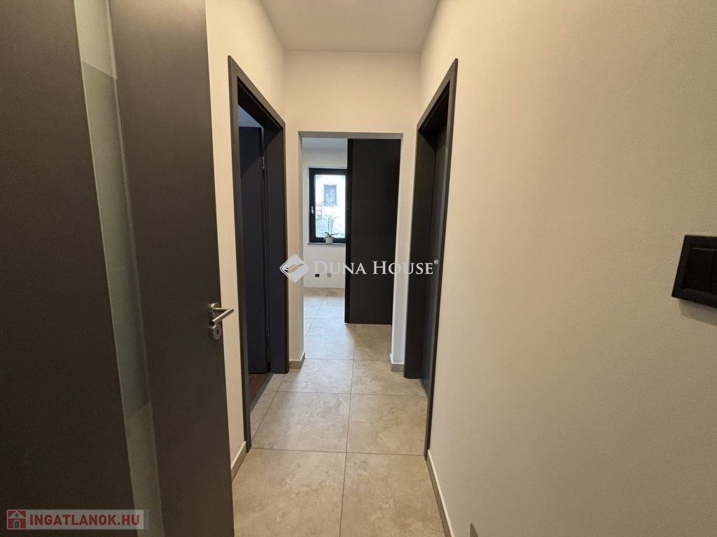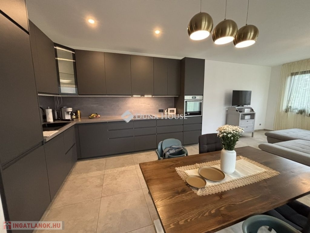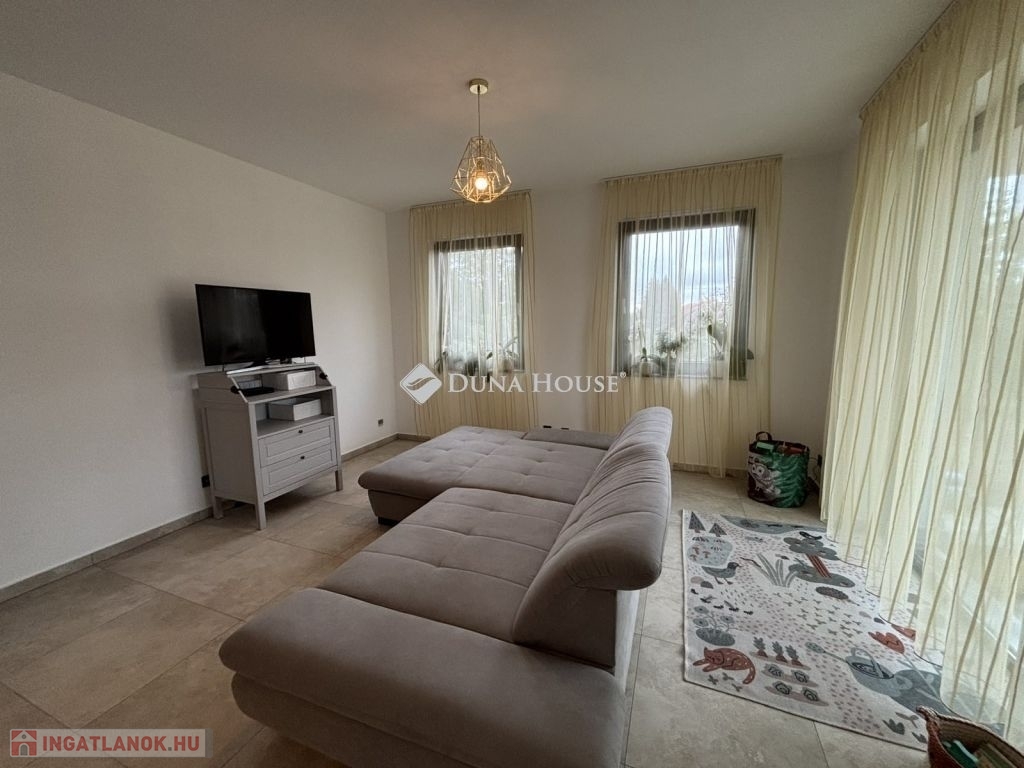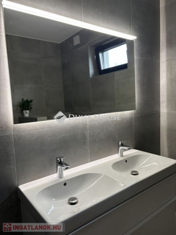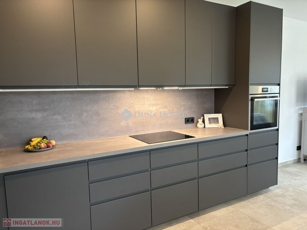 874 m²-es telken, (önálló helyrajzi számon nyilvántartott) 106,86 m² alapterületű, tégla fő- és válaszfalakkal épült, nappali + 3 szobás családi ház várja új tulajdonosát.Modern, okos családi ház eladó csendes környékenFőbb jellemzők:-Teljes körű LOXONE okosotthon rendszer: fűtés, redőnyök és riasztórendszer, amely szabadon bővíthető, és távolról (telefonról) is vezérelhető.-Energiatudatos működés: 3,4 kW napelem rendszer, kondenzációs gázkazán és szobánként külön szabályozható padlófűtés.-Klímakomfort: Daikin Comfora hűtő-fűtő klíma (3,5 kW) + előkészítés további egységhez (hálórész).-Biztonság: kültéri IP kamera (TP-Link, mobilról elérhető) és riasztórendszer.-Prémium nyílászárók: 3 rétegű, GEALAN S9000 ablakok, kívül-belül antracit színben, elektromos alumínium redőnyökkel és szúnyoghálóval.-Időtálló részletek: színezett alumínium ereszcsatorna, kívül-belül műkő párkányok.Belső kialakítás:-Teljesen gépesített IKEA konyha, és PAX gardróbszekrény.-Geberit dupla mosdós fürdőszoba szekrény fűthető Geberit Xeno tükörrel.-Geberit rimless fali WC-k.-Full Doors CPL fóliás ajtók tömör faforgács betéttel.-Bette 180x80 titánacél kád, Hansgrohe csaptelepek.Telek és környezet-Privát, nyeles telek, csendes elhelyezkedéssel, teljes nyugalmat biztosítva.-30 m²-es térkövezett terasz.-Fúrt kút és kerti csap.-6 m²-es kerti tároló pincével.Az udvar végső kialakítása az új tulajdonosra vár.Ez az ingatlan a modern technológiát, az energiatakarékosságot és a kényelmet ötvözi ideális választás, ha biztonságos, jól felszerelt, trendi, okos otthont keresel nyugodt környezetben.