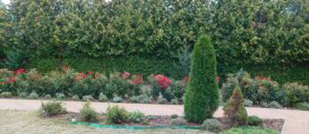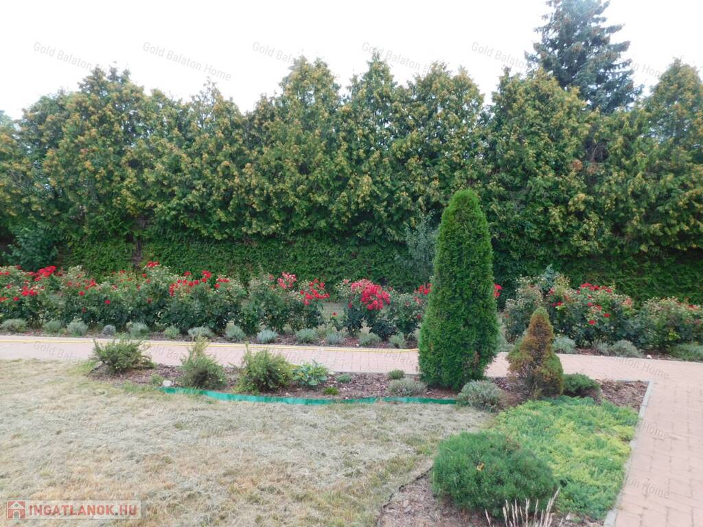 - körbekerített telek, virágokkal, rózsákkal beültetett kert