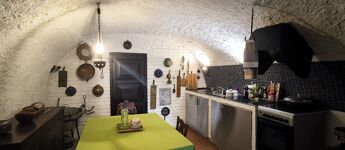Az épület egy része földben lévő, földdel borított, vastag kő falakból álló pince. Ebben a részben található az étkező- konyha fa tüzeléses búbos kemence, egy kádas fürdőszoba és egy tároló.