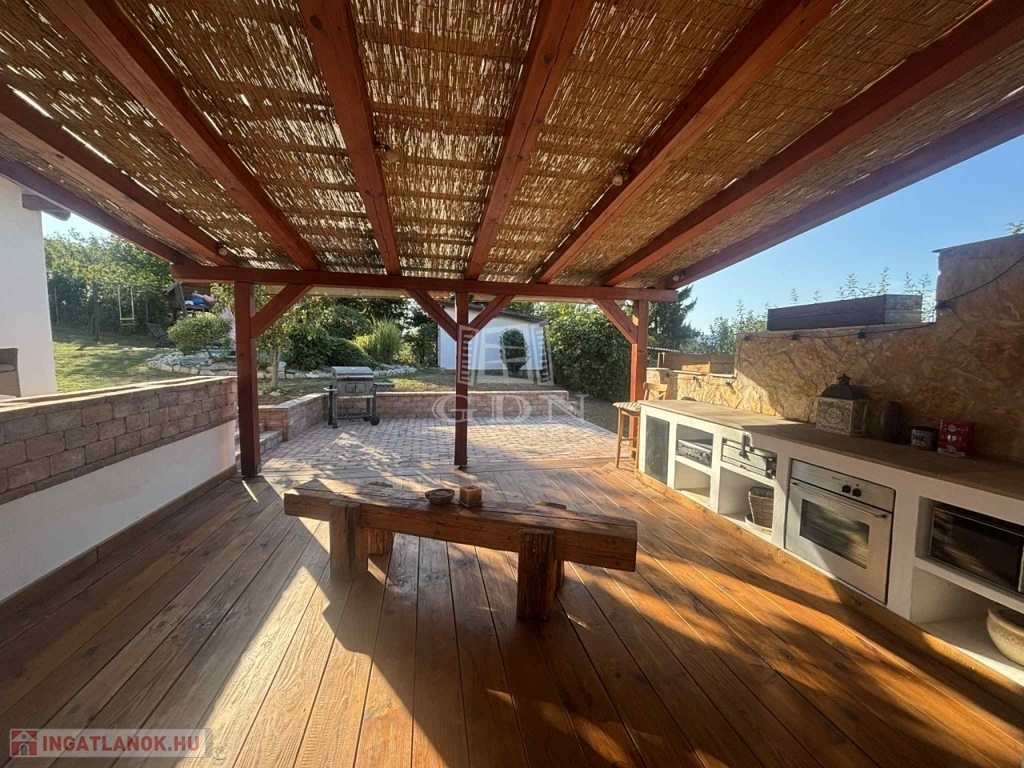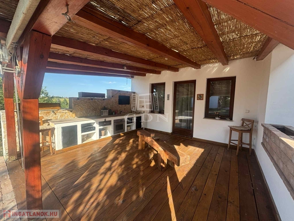 Az ingatlan egyik éke az 50 m-es részben fedett terasz, amely gépesített nyári konyhával felszerelt.