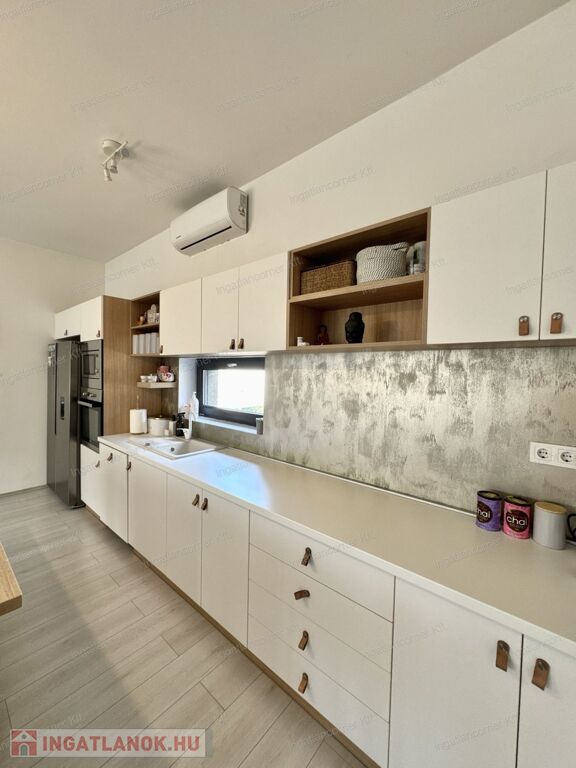A belső tér elegáns és letisztult – egyedi tervezésű bútorok, csendesített fiókok és ajtók, minőségi burkolatok és energiatakarékos beépített gépek biztosítják, hogy ez az otthon nemcsak szép, hanem kifejezetten praktikus és gazdaságos is legyen.