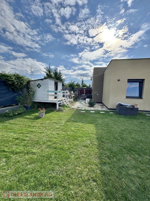 2019-ben épült, modern és különleges hangulatú ikerház eladó Dunaharaszti egyik legkedveltebb, csendes, zöldövezeti részén, a Bezerédi lakópark zsákutcájának legvégén.