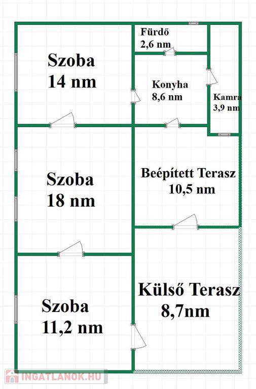 Elosztását tekintve 3 szobával, konyhával, fürdőszobával, spájzzal, beépített terasszal rendelkezik.