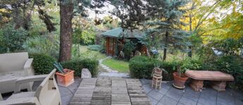 720nm-es kert melyben helyet kapott az épített sütőgető mellett egy közel 30nm-es kerti pavilon szaunával és tárolókkal.