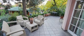 A ház előtt 5nm-es mögötte 17nm-es teraszt találunk melyről szinte az egész parkosított udvart belátni magasabb elhelyezkedésének köszönhetően.