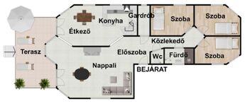 A tágas, közel 40nm-es nappali az ingatlan egyik oldalán míg a lakószobák a másik oldalán helyezkedik el lehetőséget kínálva a társasági élet számára.