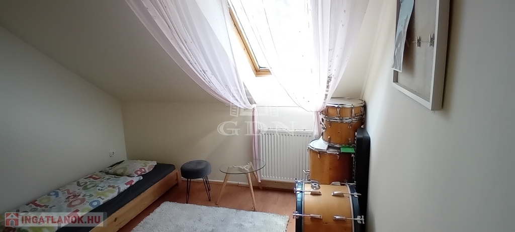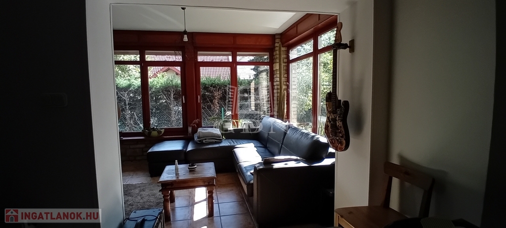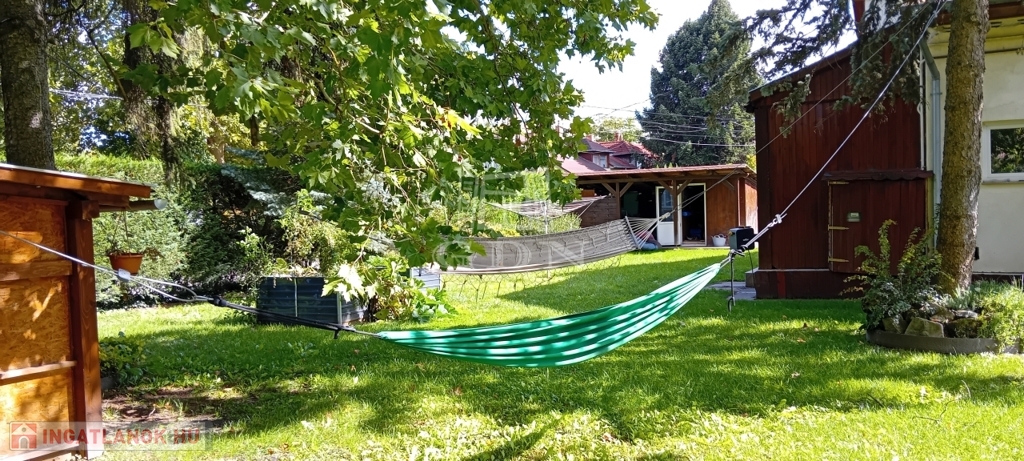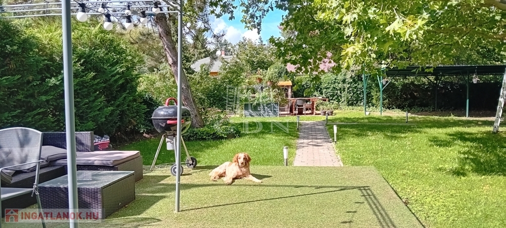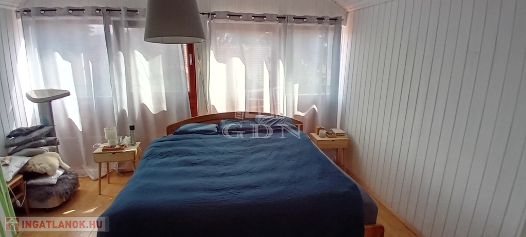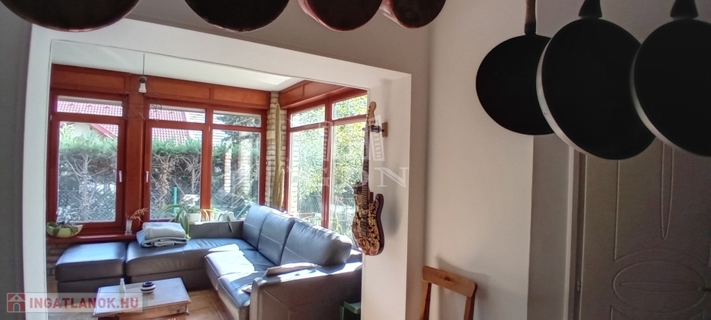 A gondozott kert végében, a természetbe simulva találunk egy különálló összkomfortos, amerikai konyhás nappali+2 szobás gerendaházat is, amely teljesen elszaparált élettere lehet egy több generációs család egyik felének, vagy pedig vendégházként, irodaként is üzemelhet.