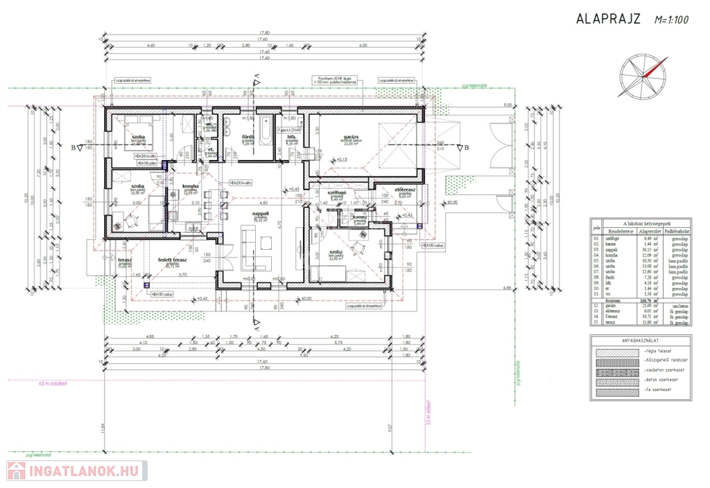 A tető héjazata antracit betoncserép lesz, a homlokzatok 15cm EPS, a padló 10cm Austrotherm AT-N100-as, a vízszintes födém 25cm Ásványgyapot szigeteléssel lesz ellátva.