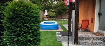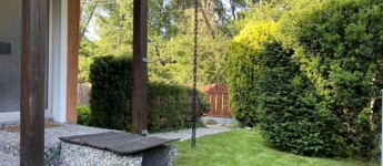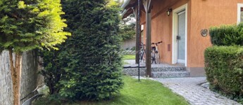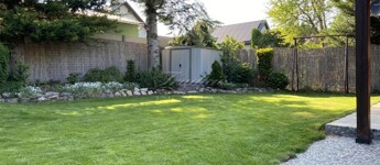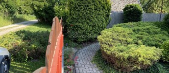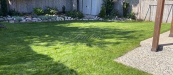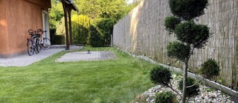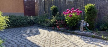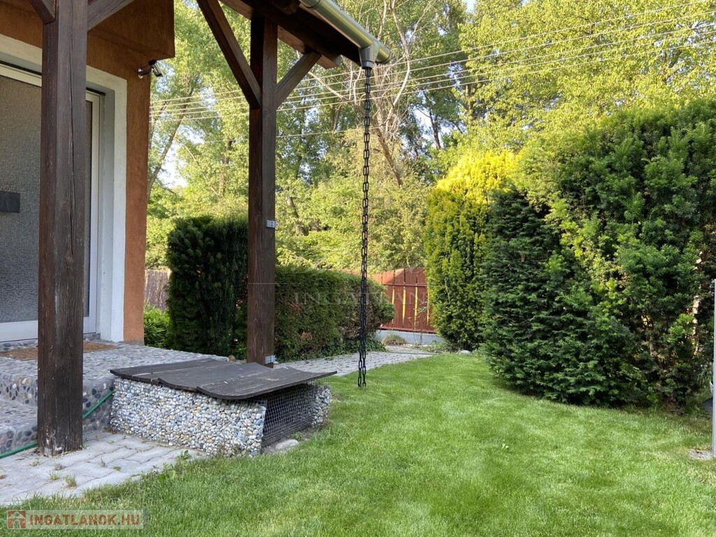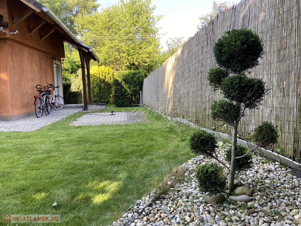 A gyönyörűen karbantartott, parkosított 311 m2-es, 40-50 éves fákkal, virágokkal, vakondhálóval, automata öntözőrendszerrel, robotfűnyíróval rendelkező telken a ház mellett egy 6 m2-es kerti tároló, grillező, valamint egy térkövezett rész is helyet kapott, ami ideális medence, vagy jakuzzi elhelyezése. A térkövezett gépkocsibeálló az előkertben található.