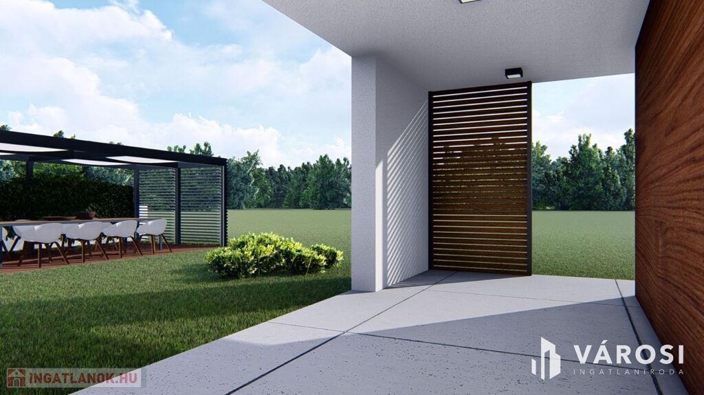 A földszintes, remek elrendezésű, ideális -DNY-i- tájolású nappali+3 hálószobás lakás nettó hasznos lakóterülete 126,29 m2, melyhez összesen 63,61m2 terasz és egy 39 m2 alapterületű dupla gépkocsibeálló tartozik, 585 m2 önálló saját telekrészzel.