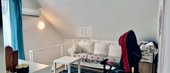 Az első lakrészbe belépve egy tágas, beépített konyhabútoros konyha étkezővel fogad minket! Innen nyílik egy wc ami háztartási helyiségként is funkciónál, itt található a mosógép, valamint egy korszerű bojler is. Ebből a helyiségből tudunk felmenni a felső szintre. Az emeletre felérve, egy kis nappaliba érkezünk, ahonnan nyílik egy tágas, káddal ellátott fürdőszoba, valamint 2 szoba és egy kis közlekedő. A kisebb szobából egy erkélyre is kiléphetünk.