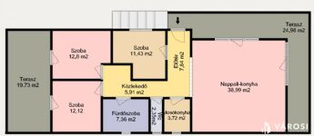 Alaprajz szerinti elrendezésben 103 m2 fűtött alapterület, 44,7 m2 terasz, valamint a garázs 36,47 m2.