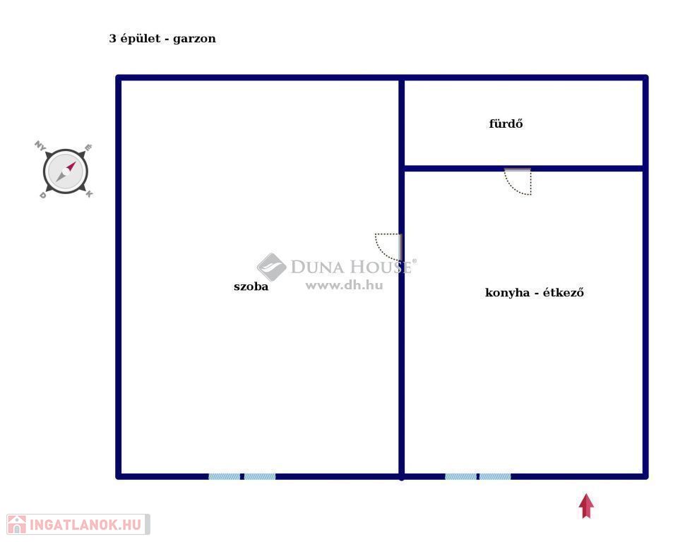 Térfelosztása az alábbi: szoba, konyha-étkező, fürdő