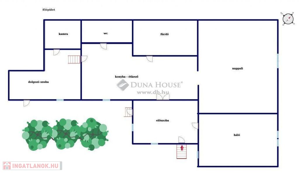 Térfelosztása az alábbi: nappali, háló, konyha-étkező, kamra, fürdő- és előszoba.