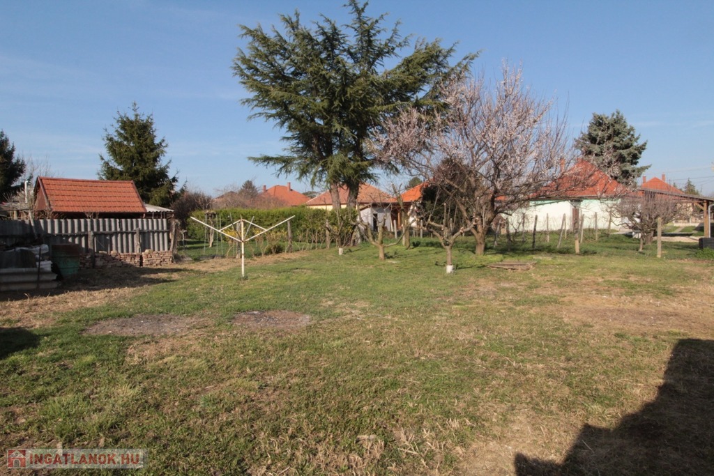 A 680 m²-es, sík telken található egy nagy barackfa, amely alatt árnyas kiülő létesíthető. Az intim, kedves hangulatú kert nem elhanyagolt. A locsolás 12 méteres fúrt kútból is megoldható. Több autó parkolására van lehetőség az udvaron és a ház előtt is.