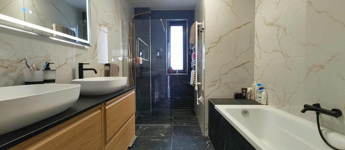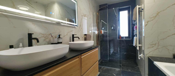 Emeleten: 3 szoba, 2 fürdőszoba, 2 terasz.