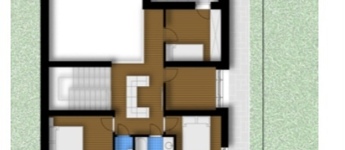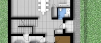 Méretek: Az épület nettó alapterülete összesen, teraszokkal és erkélyekkel 194,77 m2, plusz dupla garázs 31 m2, kert tervezett zöldfelülete 553,61 m2. A ház 2 szintes, a garázsból is megközelíthető földszinten egy szoba, nappali-konyha- étkező, kamra, WC-s zuhanyzó, mosókonyha, a lépcsőház alatt gépészeti helyiség található. Nagy méretű terasz (18,5 m2) kapcsolja össze a nappalit a kerttel. Az emeleten 3 szoba, különálló WC, fürdőszoba káddal, gardrób, 2 erkély (13 és 5 m2) és galéria kapott helyet.