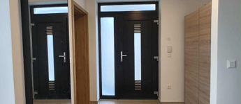 Homlokzati nyílászárókkal megegyező színben, műanyag bejárati ajtó