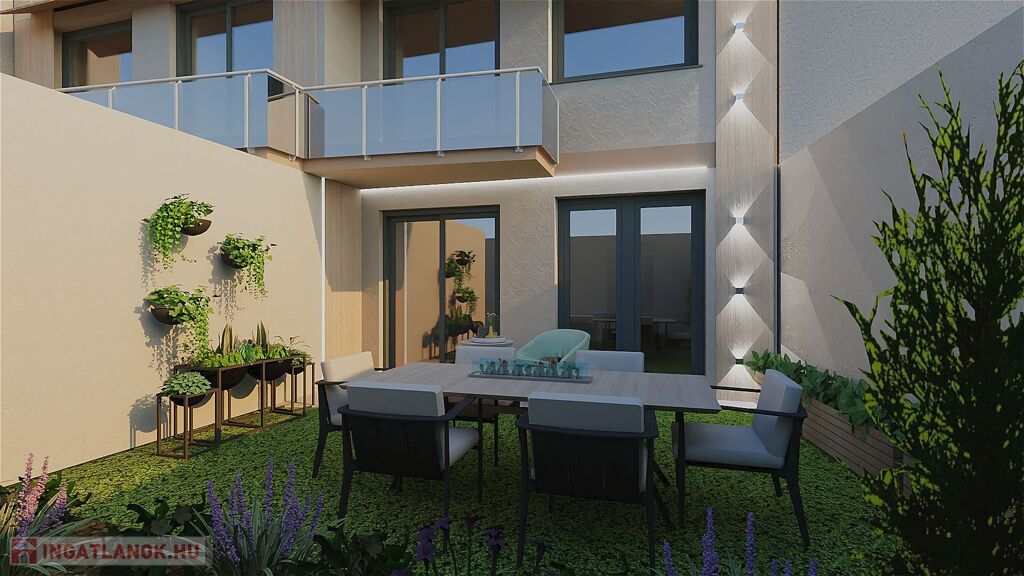 Az ingatlan dupla soros téglafal mentén, garázsoknál összeépített ikerház, így kiváló hő- és hangszigetelést biztosít. A telekrész kb. 150 m², ideális méret a könnyen fenntartható, zöld udvarhoz.
