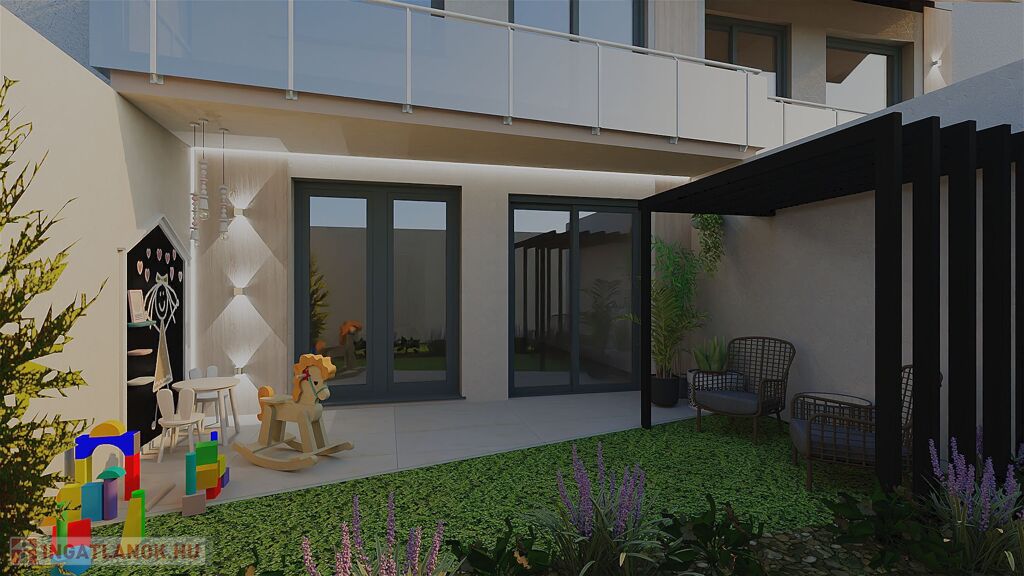 A 3 szoba + nappali-konyha-étkező elrendezésű otthon kiváló beosztású:– a tágas nappali közvetlen teraszkapcsolattal nyit a kertre,– két fürdőszoba és két WC biztosítja a kényelmet,– háztartási helyiség és külön gardrób is helyet kapott – ahogy egy igazán jól megtervezett otthonban elvárható.