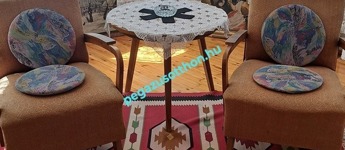 lambériázott és festett belső terek. Betonozott pihenőhely a garázs és a melléképület
