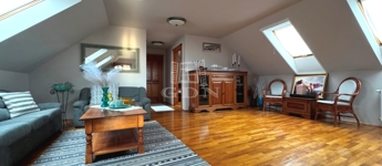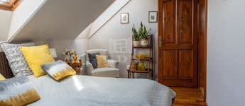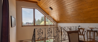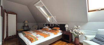 A tetőtérben egy tágas nappali, két hálószoba, gardrób és fürdőszoba kapott helyet. A szinthez kapcsolódik egy részben zárt, 22 m²-es panorámás erkély, ahonnan lenyűgöző kilátás nyílik a környező tájra és a Velencei-tó irányába.