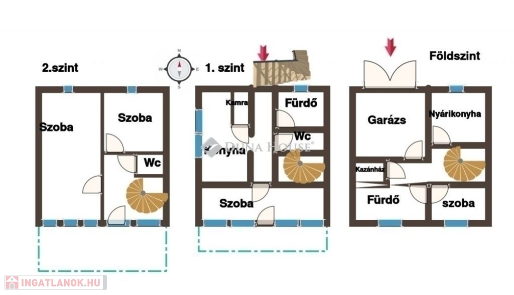 * **Alsó szint**: aknás garázs, kazánhelyiség és három további helyiség, melyek szobává alakíthatók.