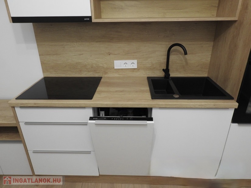 A teljesen felszerelt konyha és a beépített szekrények praktikus helykihasználást biztosítanak.
