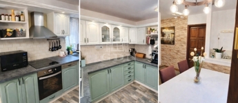 Tágas, nagy légterű nyitott, étkezős konyha.