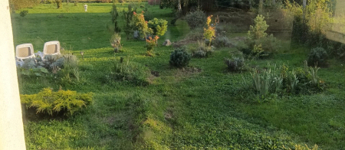 A házhoz tartozó patak parti kert gondozott, sík, jó arányú telken igényes kialakítású, japánkert stílusú. Méreténél fogva akár lótartásra is alkalmas.