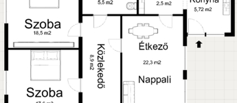 Helyiségei : nappali - étkező egy légtérben ( de kialakítható: konyha - étkező - nappali is egyben ), 2 db nagy szoba, fürdő , wc , külön főzőfülke, és külön konyha, illetve a tágas közlekedő. ( alaprajzot mellékeltem )