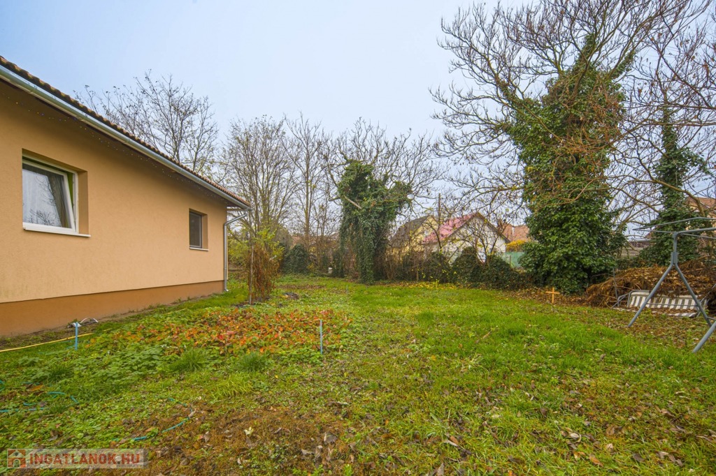 A 736 m²-es telken elhelyezkedő ingatlanban 3 hálószoba, amerikai konyhás nappali, fürdőszoba, vendégmosdó és egy spejz kapott helyet.