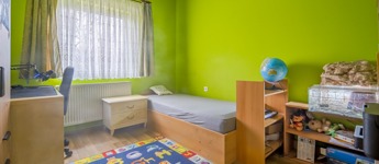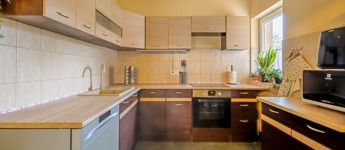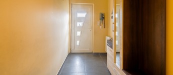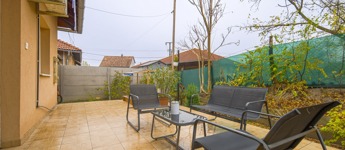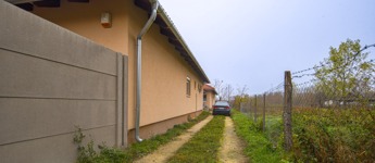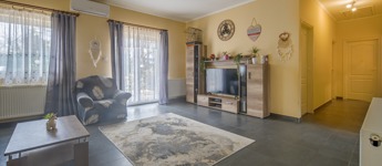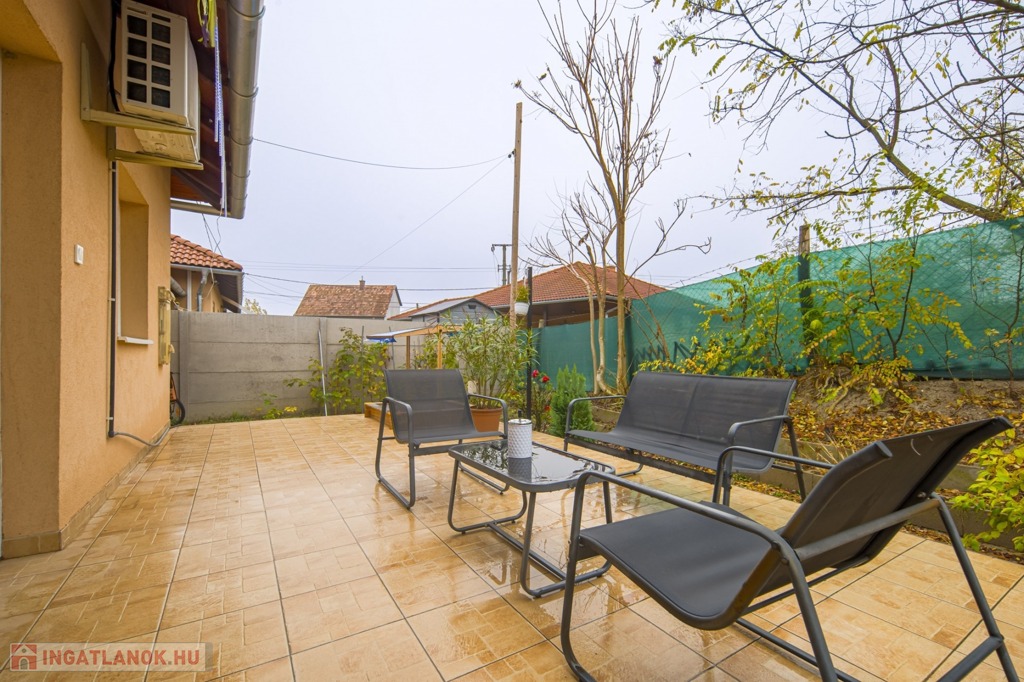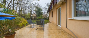 Az ingatlan a 22 m²-es garázson keresztül kapcsolódik a szomszédos épülethez. A nagyméretű teraszra a nappaliból lehet kilépni, és a telek elrendezésének köszönhetően az ingatlan szinte teljesen körbejárható.
