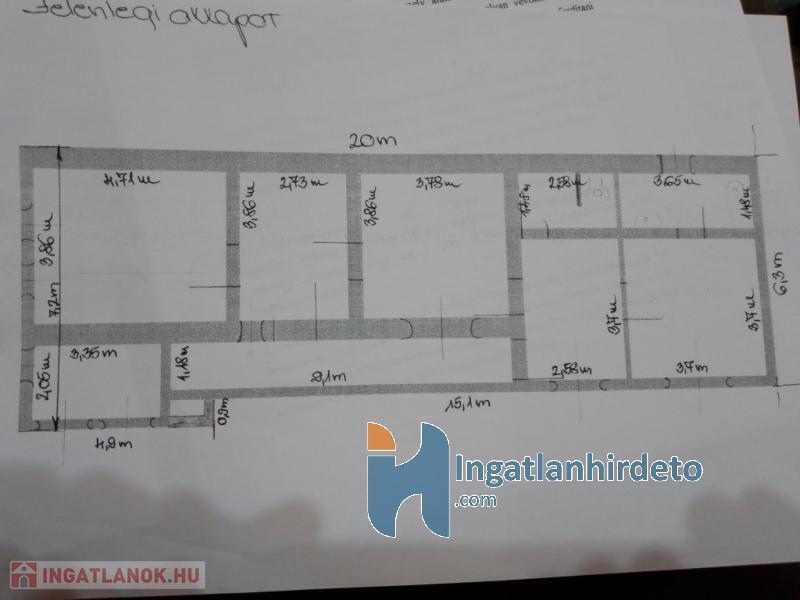 Elhelyezkedése: Belterület Tájolása: Dél-nyugai tájolású Állapota: Használt - felújítandó Komfort besorolása: Komfort nélküli Építési éve: 1955 Alapterülete: 93 m2 Telekterülete: 868 m2 Szobák száma: 4 + 1 szoba Felújított: Felújított Felújítás éve: 2020 Felújítás során elvégzett munkák: Belső átépítés, Tetőfelújítás Közművek: Gáz, Víz, Villany, Csatorna Gázellátás: Telekhatáron Vízellátás: Vezetékes víz Áramellátás: Telekhatáron Homlokzat állapot: Felújítandó Építési mód: Tégla, Vályog, Vegyes falazat Tető formája: Magas Tető anyaga: Cserép Parkolási lehetőség: Garázsban, Utcán, Telken Kilátás: Utcafronti kilátás, Udvari kilátás, Egyéb panorámás Napelem: Nincs Jellemzői: Csendes környék, Jó közlekedés, Két bejárat, Étkező, Kert, Kerítés, Egyedi vízóra , Saját fúrt kút, Zöldterület, Jó közbiztonság Energetikai besorolás: Nincs adat Egyéb jellemzők: Pince Tv, Internet: Kábeltévé, Internet, Vezetékes telefon Közelben: Iskola, Óvoda, Autóbuszállomás, Orvosi rendelő, Bolt, Gyógyszertár, Postahivatal, Vendéglátó egység Terhelések: Tehermentes ingatlan