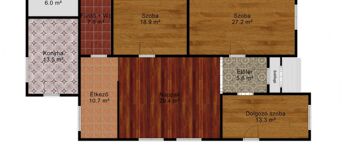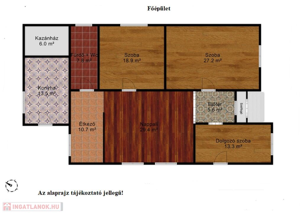 Főépület helyiségei: 2 szoba + nappali, dolgozó szoba, fürdőszoba + wc, konyha, étkező, kazánház.