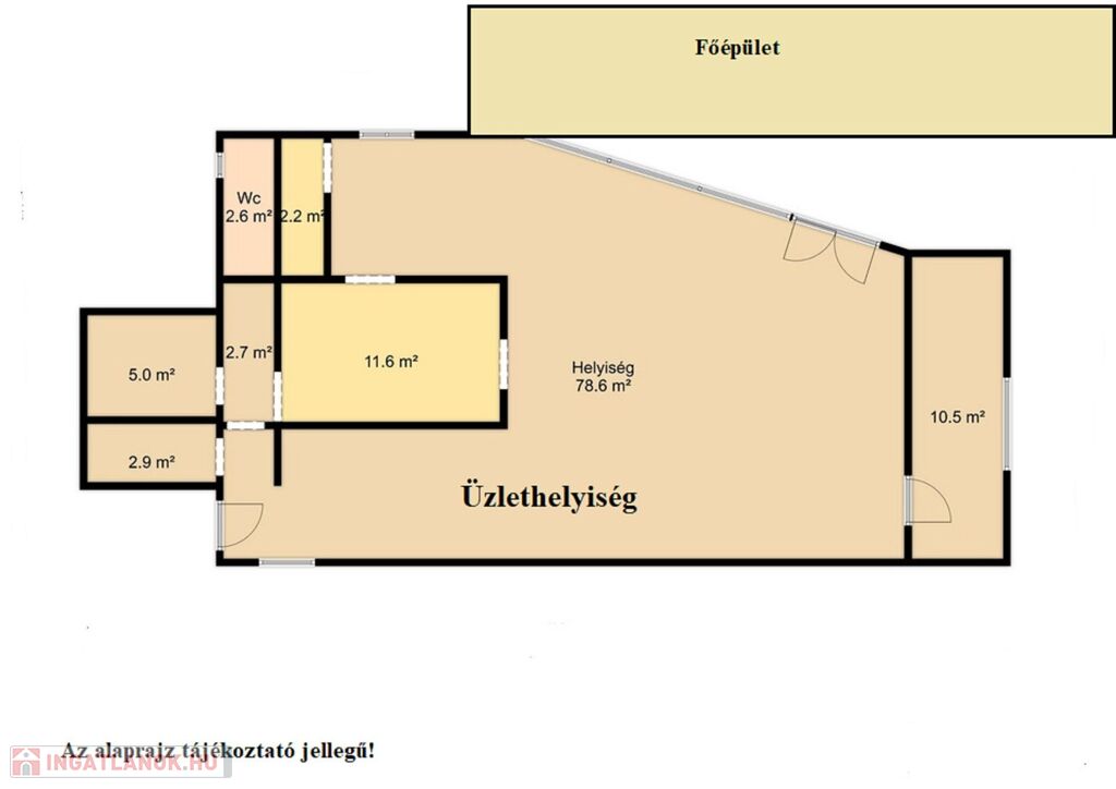 A főépülethez egy üzlethelyiség került építésre, ami 120 m2 alapterületű, amely több, kisebb, hidegburkolattal ellátott helyiségből áll. Homlokzata hőszigeteléssel, nemesvakolattal burkolt. Nyílászárók, fa tokozású dupla üvegezéssel ellátottak. Rendelkezik minden közművel, viszont fűtés nincs benne. Villamos hálózat: 3*16A. Az épületrész 2 bejárattal rendelkezik. Tevékenység függően felújításra szorul. Parkolási lehetőség az ingatlan udvarrészén lehetséges.