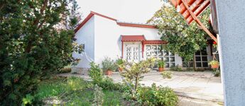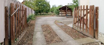 Az udvar rendezett, az előkert dísznövényekkel van telepítve. Fedett garázs és egy tárolóhelyiség található még a területen.