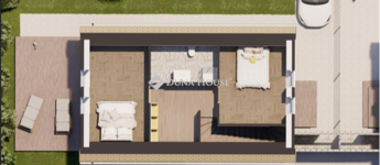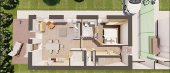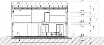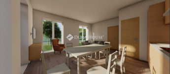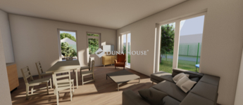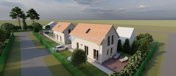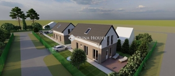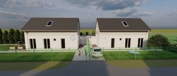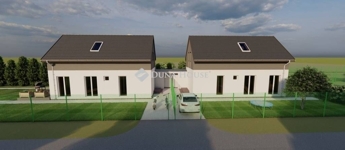 Egy telken belül - megosztott használatban - két egyforma ház épül. Ehhez az ingatlanhoz 234 négyzetméter alapterület tartozik. A telken elhelyezkedő ház 103 négyzetméter. Két szintet kapott. Az alsó szinten kialakításra került egy nappali + konyha, egy szoba, fürdőszoba + WC, közlekedő, illetve egy kamra. A nappaliból nyílik a terasz, ami 18 négyzetméteres. A lépcsőn feljutunk a tetőtér közlekedőjébe, ahonnan külön nyílik két szoba, illetve egy zuhanyzó + WC.