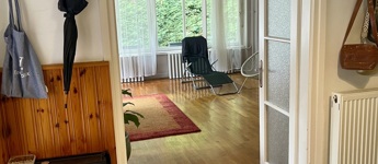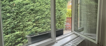 A két hálószoba az utcára néz a nappali és a konyha a kertre.