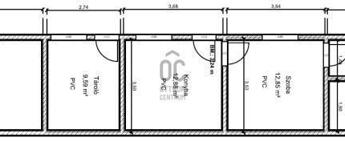 - két hálószoba, konyha + étkező, közlekedő, fürdő + WC, tároló helyiségekből áll