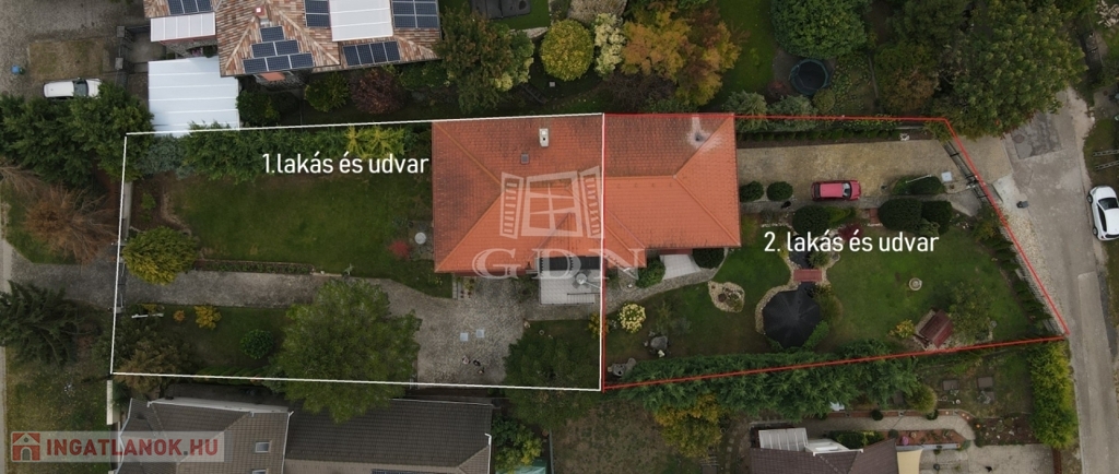 Az ingatlan területe 1421 m2, két utcafrontos, a ház a telek középen helyezkedik el, így mind az alsó mind a felső lakás saját, külön utcára nyíló bejárattal, saját 710m2 –es telekrésszel mérőórákkal rendelkezik.