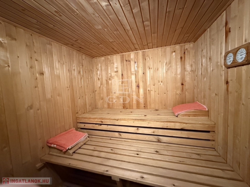 A földszinti 1 számú lakás 160m2 egy tágas, világos (45m2) nappali, étkezős konyha, 1 hálószoba, fürdőszoba, háztartási helyiség, valamint egy 36 négyzetméteres garázs található, ahonnan közvetlen bejárás nyílik a lakótérbe. A nappaliból közvetlen kijárat vezet a 16 m2-es teraszra, a szuterén részben kapott helyet egy pihenőszoba, ami jelenleg a 6 személyes szaunának ad helyet, valamint egy fürdő, wc, , pince a hozzá tartozó „ borozó”-val, valamint a garázs.