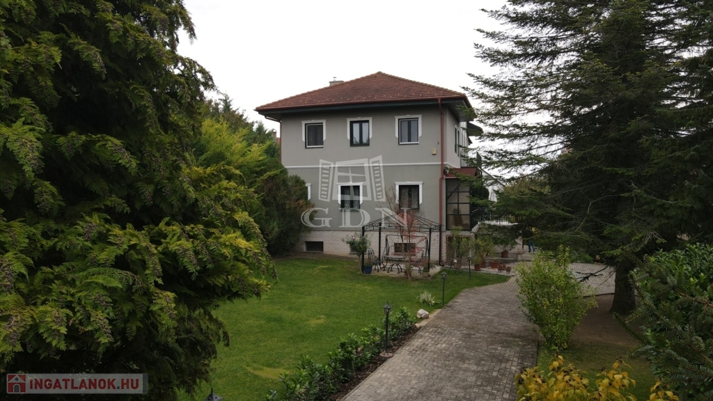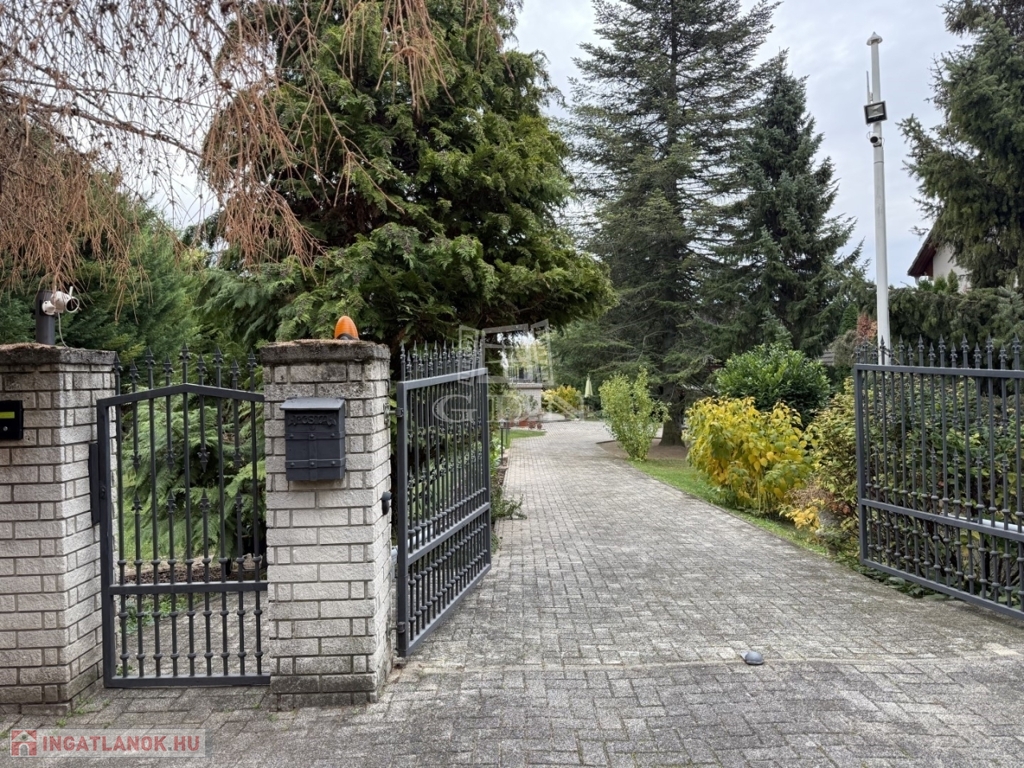A gyönyörűen parkosított kertbe egy kovácsoltvas kapun keresztül jutunk, ahol a garázson kívül több gépjármű parkolása biztosított, térkövezett beállókkal. A kert öntözőrendszerrel ellátott. Az ingatlan riasztó és kamera rendszerrel felszerelt.